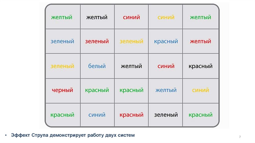 • Эффект Струпа демонстрирует работу двух систем7