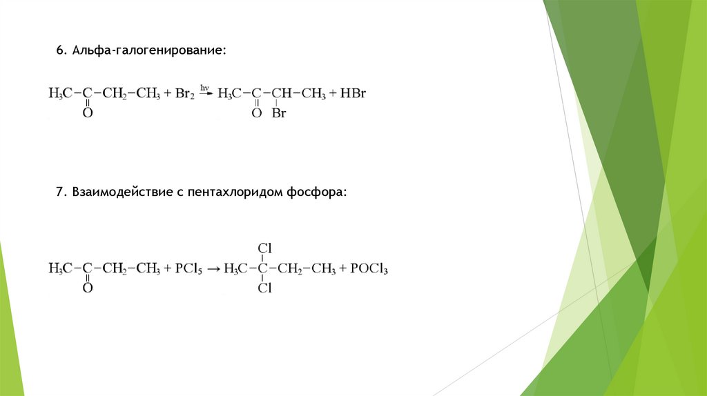 6. Альфа-галогенирование:7. Взаимодействие с пентахлоридом фосфора: