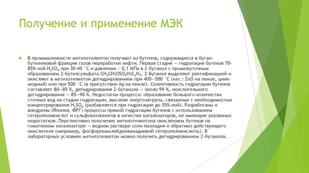 Получение и применение МЭКВ промышленности метилэтилкетон получают из бутенов, содержащихся в бутанбутиленовой фракции газов переработки нефти. Первая стадия — гидратация бутенов 7085%-ной H2SO4 при 30-40 °C и давлении ~ 0,1 МПа в 2-бутанол с промежуточным