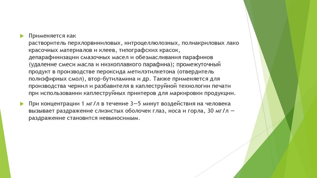 Применяется какрастворитель перхлорвиниловых, нитроцеллюлозных, полиакриловых лако