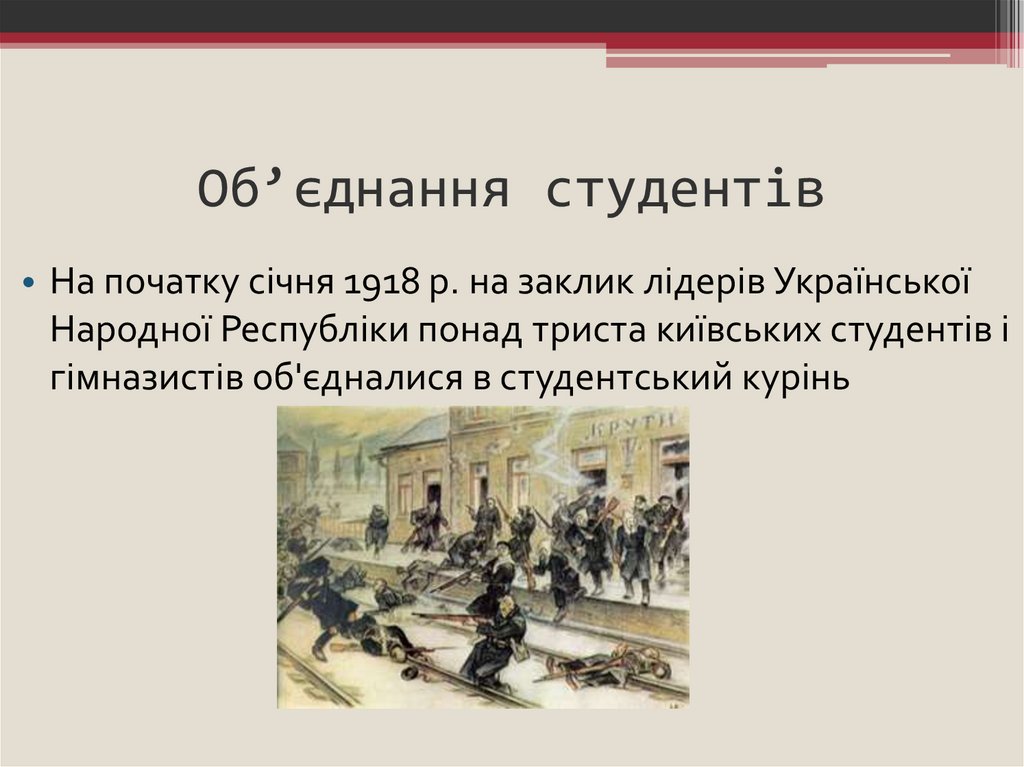 Об’єднання студентів• На початку січня 1918 р. на заклик лідерів Української