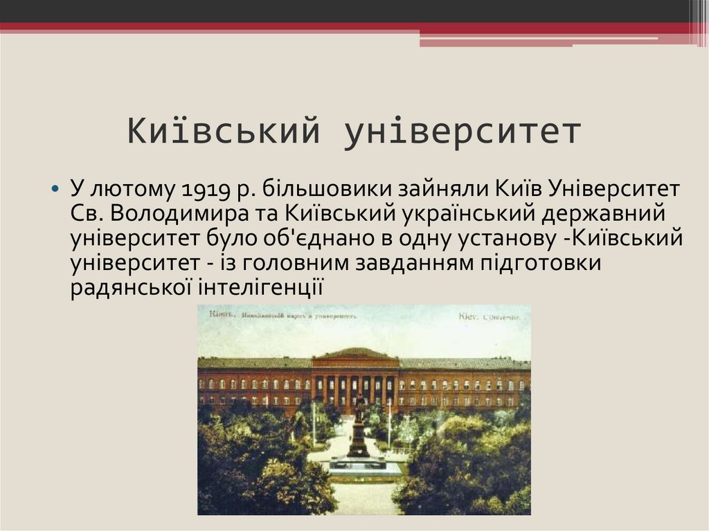 Київський університет• У лютому 1919 р. більшовики зайняли Київ Університет