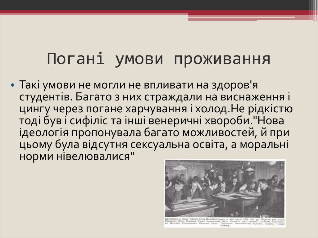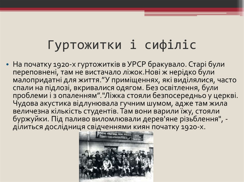 Гуртожитки і сифіліс• На початку 1920-х гуртожитків в УРСР бракувало. Старі були