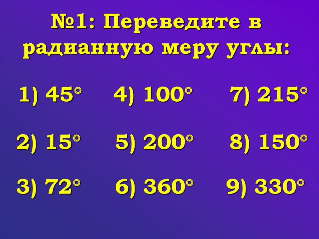 №1: Переведите врадианную меру углы: