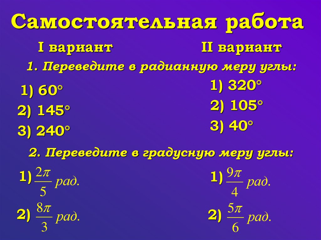 1. Переведите в радианную меру углы: