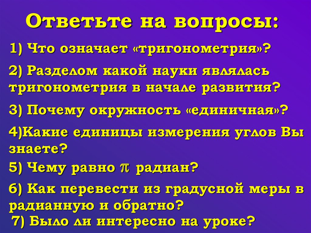 Ответьте на вопросы:1) Что означает «тригонометрия»?