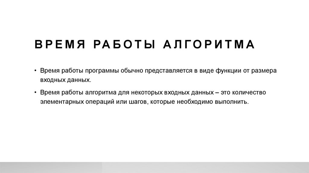 В Р Е М Я РА Б О Т Ы А Л Г О Р И Т М А• Время работы программы обычно представляется в виде функции от размера