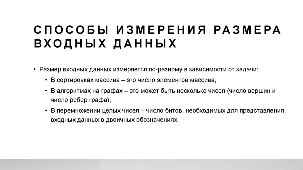 • Размер входных данных измеряется по-разному в зависимости от задачи:
