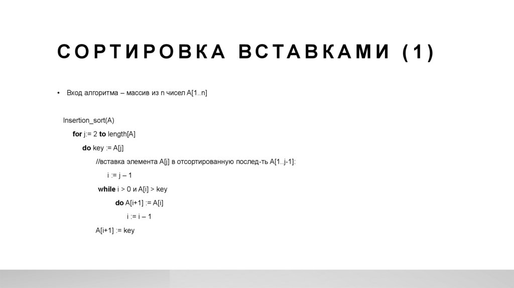 С О Р Т И Р О В К А ВС ТА В К А М И ( 1 )Вход алгоритма – массив из n чисел A[1..n]