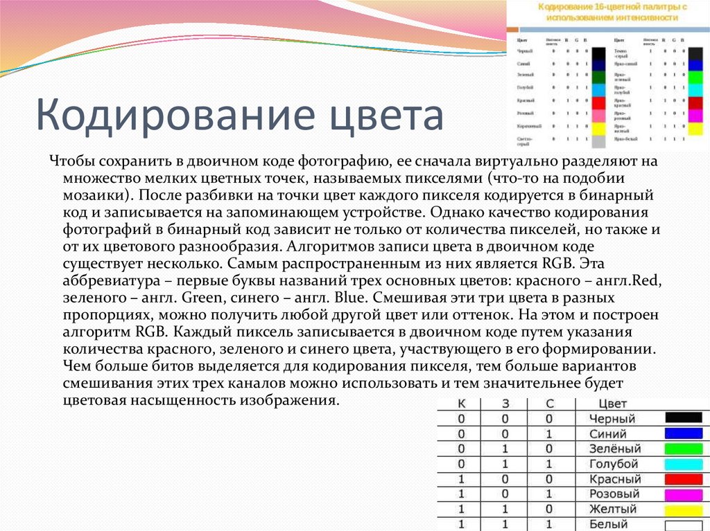 от их цветового разнообразия. Алгоритмов записи цвета в двоичном коде