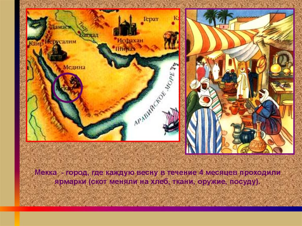 Мекка - город, где каждую весну в течение 4 месяцев проходилиярмарки (скот меняли на хлеб, ткани, оружие, посуду).