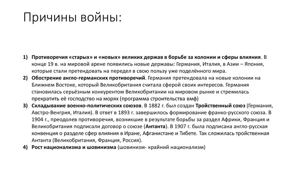 Причины войны:1) Противоречия «старых» и «новых» великих держав в борьбе за колонии и сферы влияния. В