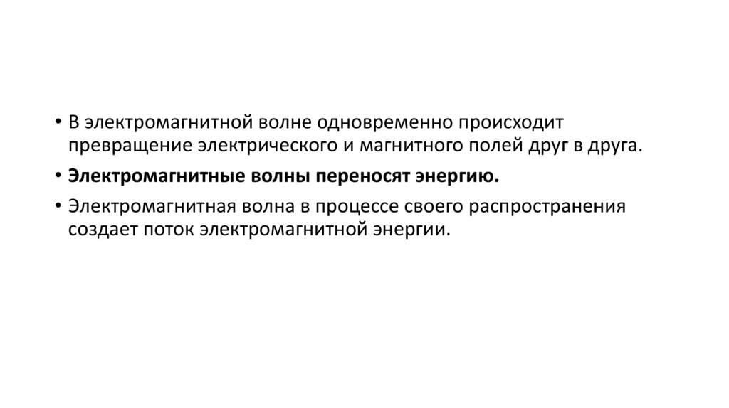 • В электромагнитной волне одновременно происходитпревращение электрического и магнитного полей друг в друга.