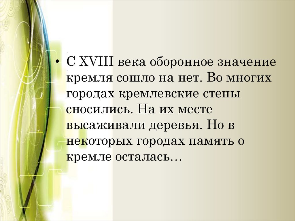• С XVIII века оборонное значениекремля сошло на нет. Во многих