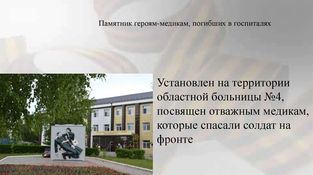 Памятник героям-медикам, погибших в госпиталяхУстановлен на территории