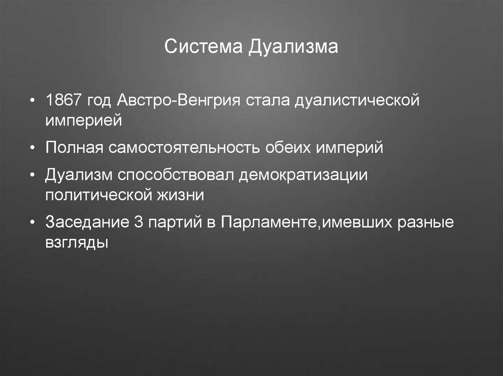Система Дуализма• 1867 год Австро-Венгрия стала дуалистической
