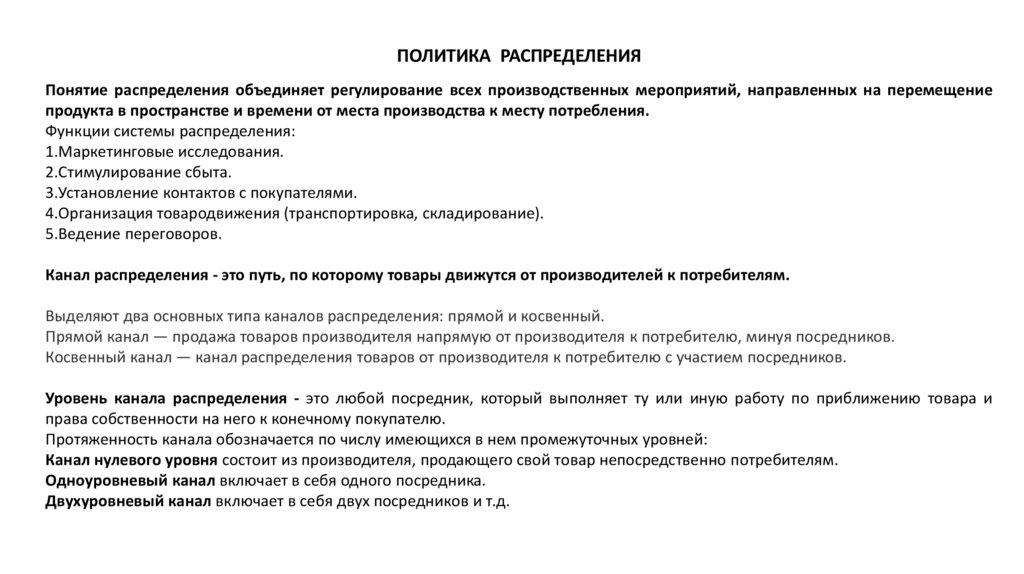 ПОЛИТИКА РАСПРЕДЕЛЕНИЯПонятие распределения объединяет регулирование всех производственных мероприятий, направленных на перемещение