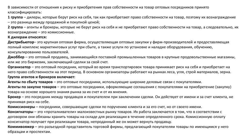 2 группа – агенты и брокеры, которые не берут риск на себя и не приобретают право собственности на товар, а следовательно, их