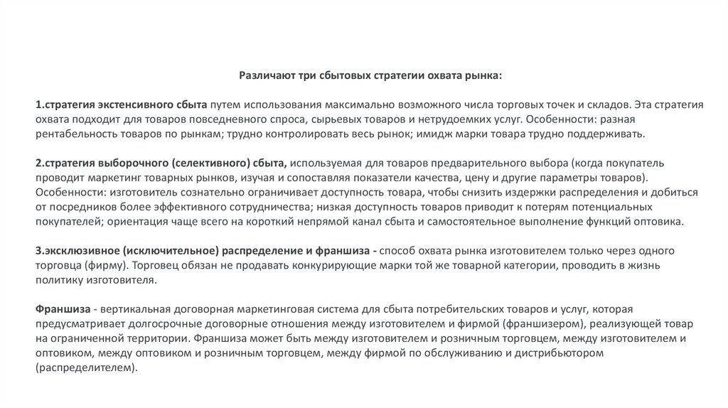 Различают три сбытовых стратегии охвата рынка:1.стратегия экстенсивного сбыта путем использования максимально возможного числа торговых точек и складов. Эта стратегия