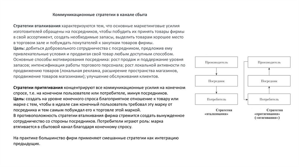 Коммуникационные стратегии в канале сбытаСтратегии вталкивания характеризуются тем, что основные маркетинговые усилия