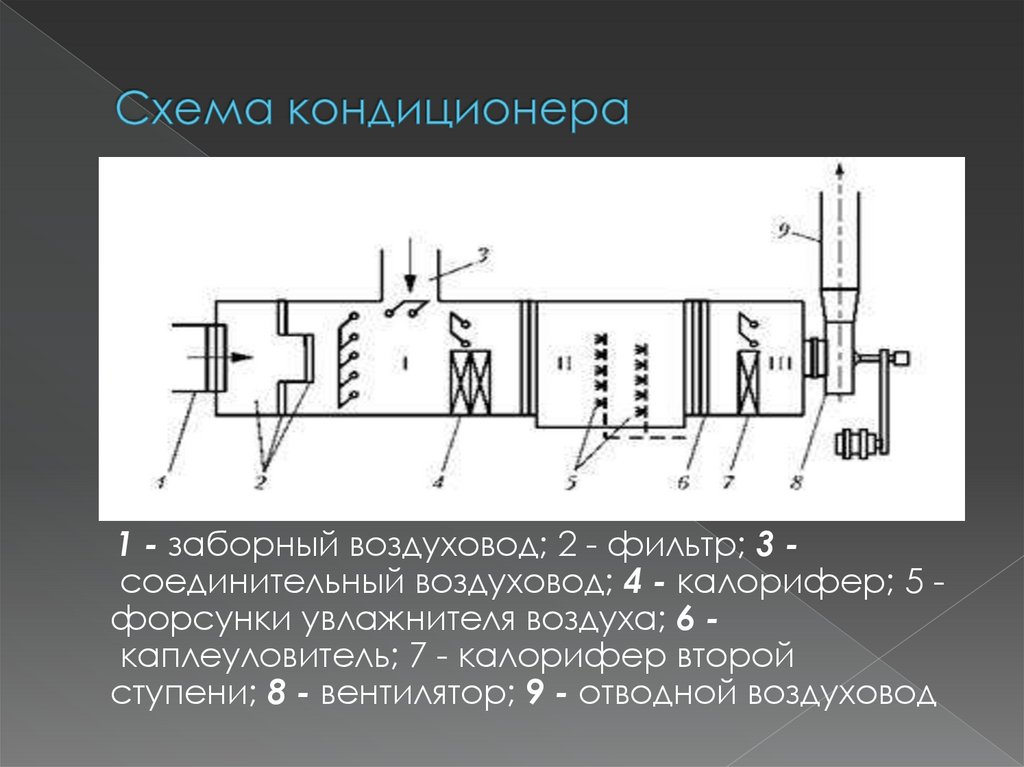 1 - заборный воздуховод; 2 - фильтр; 3 соединительный воздуховод; 4 - калорифер; 5 форсунки увлажнителя воздуха; 6 каплеуловитель; 7 - калорифер второйступени; 8 - вентилятор; 9 - отводной воздуховод