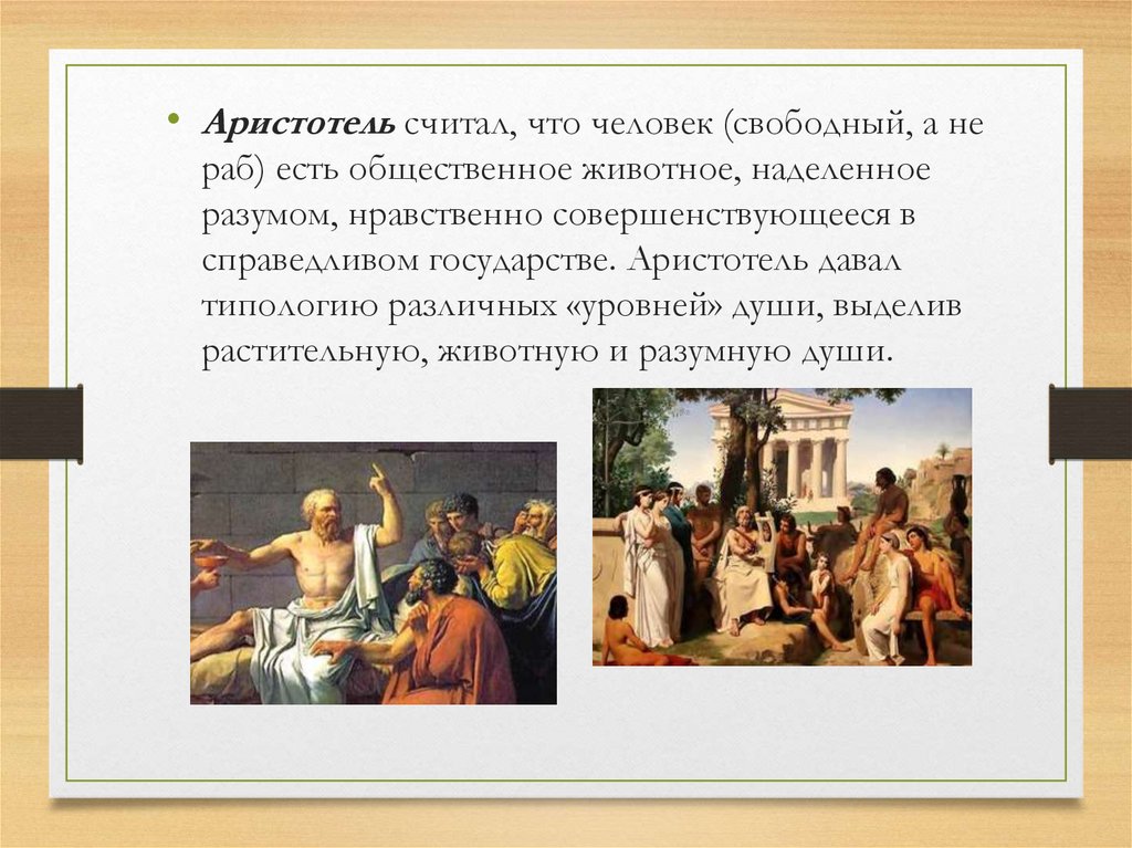 • Аристотель считал, что человек (свободный, а нераб) есть общественное животное, наделенное