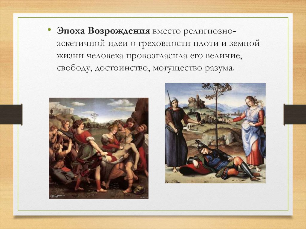 • Эпоха Возрождения вместо религиозноаскетичной идеи о греховности плоти и земнойжизни человека провозгласила его величие,