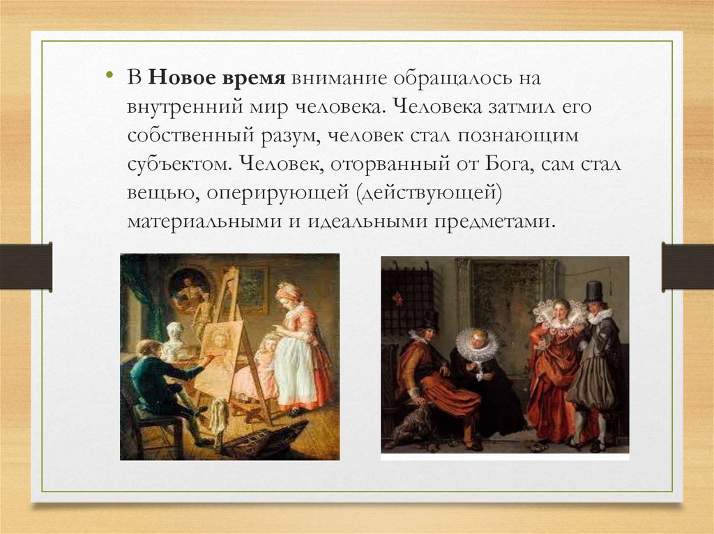 • В Новое время внимание обращалось навнутренний мир человека. Человека затмил его