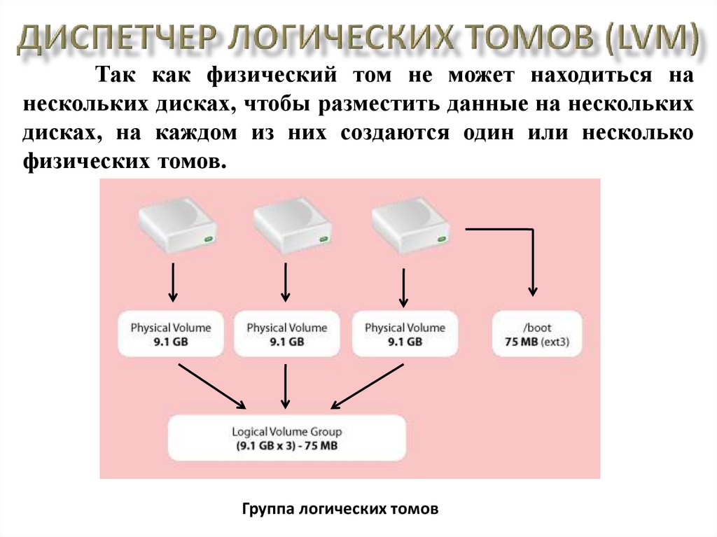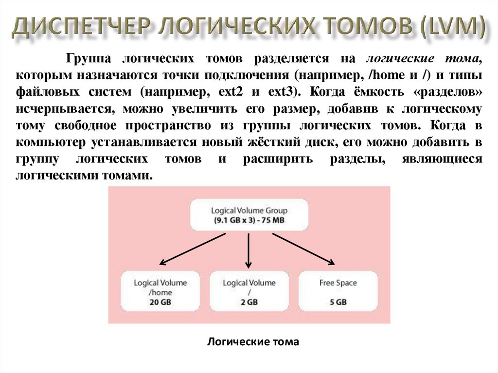 LVM — это метод распределения пространстважёсткого диска по логическим томам, размер которых
