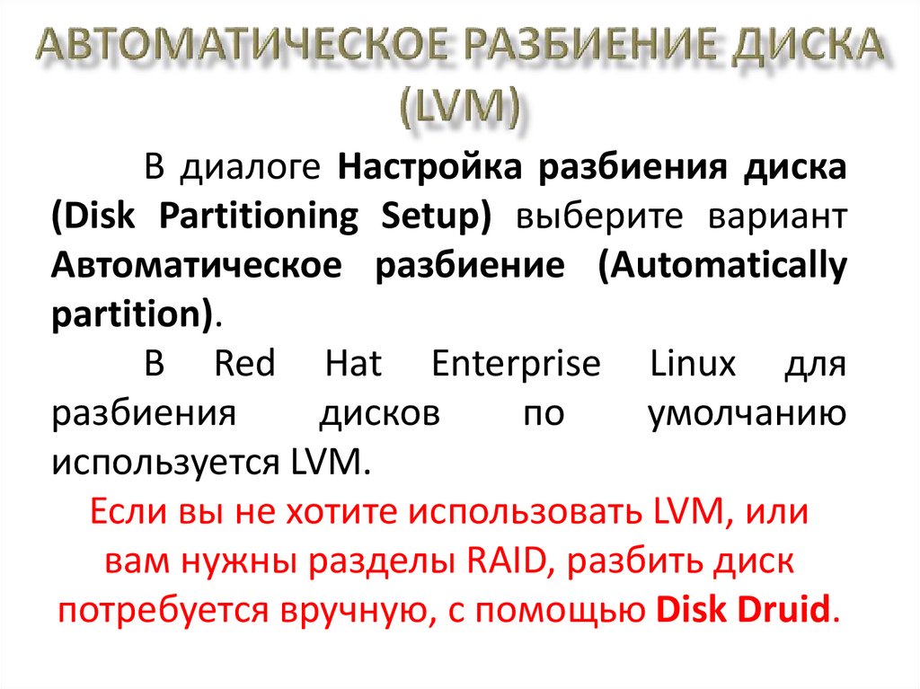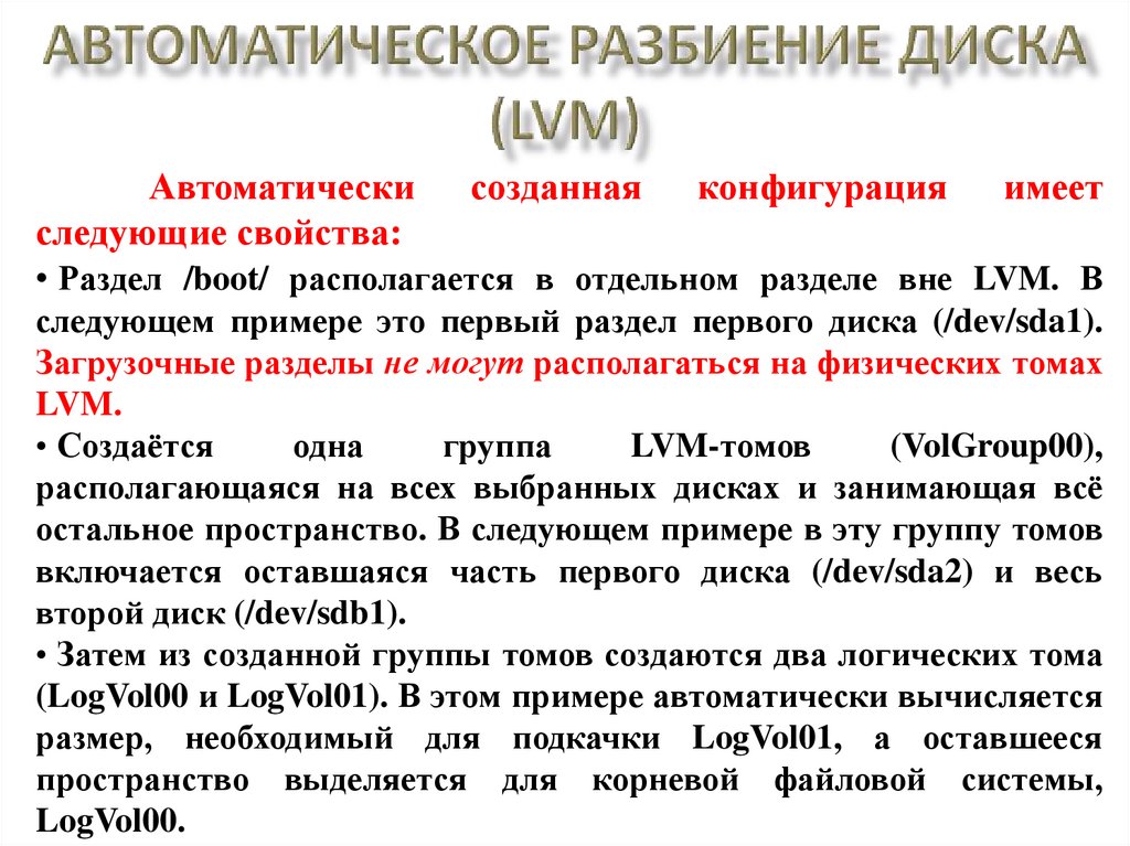 • Раздел /boot/ располагается в отдельном разделе вне LVM. В