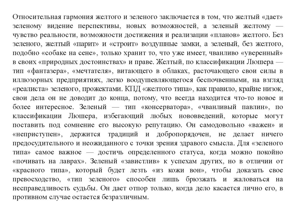 Относительная гармония желтого и зеленого заключается в том, что желтый «дает»зеленому видение перспективы, новых возможностей, а зеленый желтому —