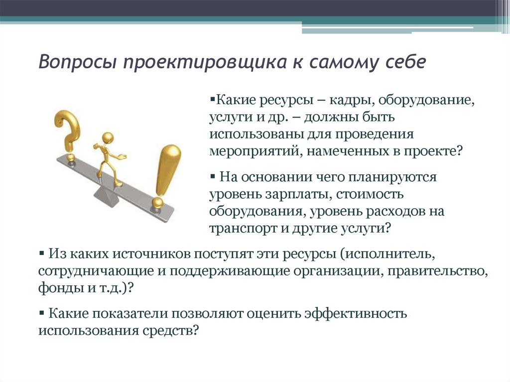 Вопросы проектировщика к самому себеКакие ресурсы – кадры, оборудование,