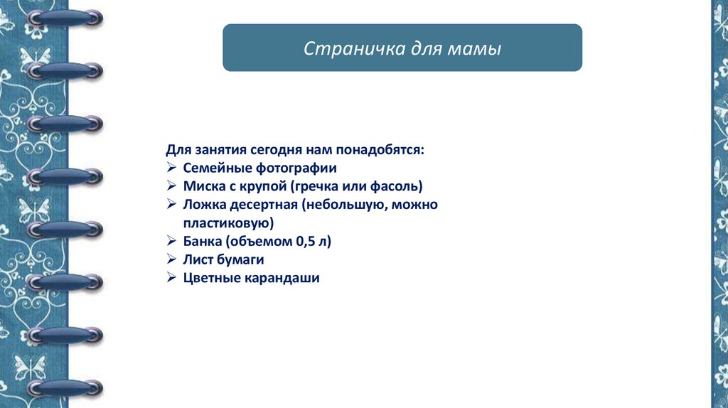Страничка для мамыДля занятия сегодня нам понадобятся: