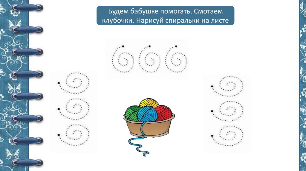Будем бабушке помогать. Смотаемклубочки. Нарисуй спиральки на листе
