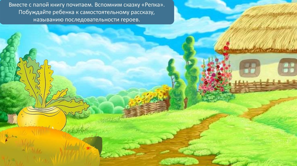 Вместе с папой книгу почитаем. Вспомним сказку «Репка».Побуждайте ребенка к самостоятельному рассказу,
