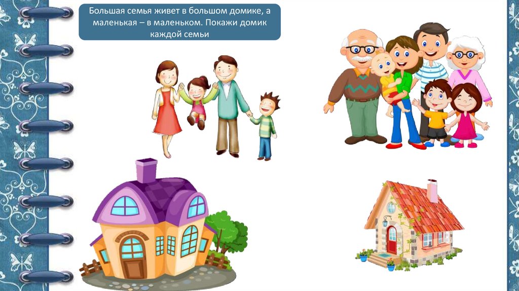 Большая семья живет в большом домике, амаленькая – в маленьком. Покажи домик