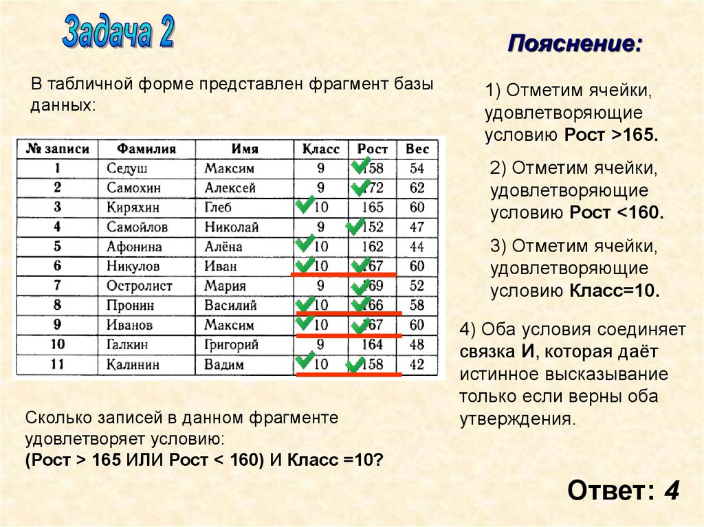 (Рост > 165 ИЛИ Рост < 160) И Класс =10?
