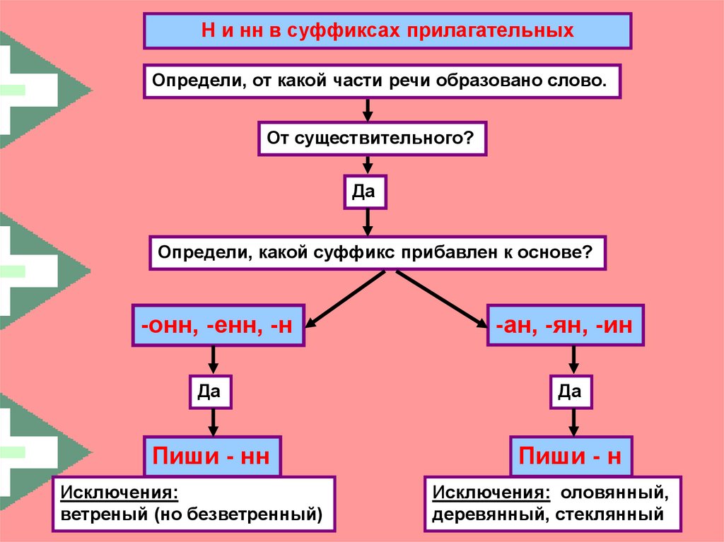 Н и нн в суффиксах прилагательныхОпредели, от какой части речи образовано слово.