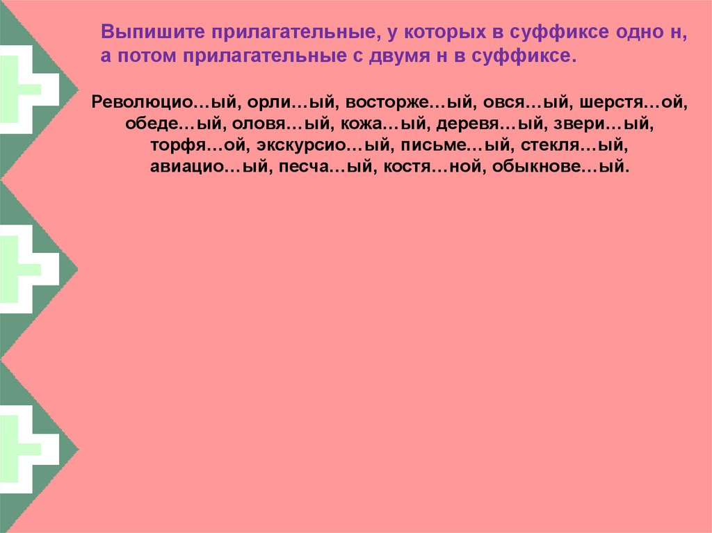 Выпишите прилагательные, у которых в суффиксе одно н,а потом прилагательные с двумя н в суффиксе.