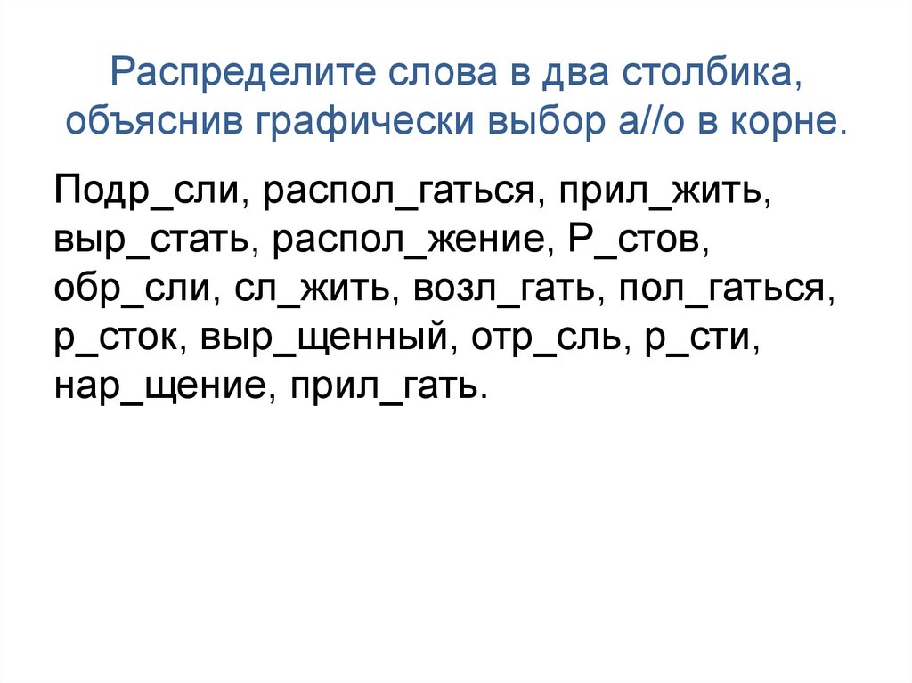 Распределите слова в два столбика,объяснив графически выбор а//о в корне.