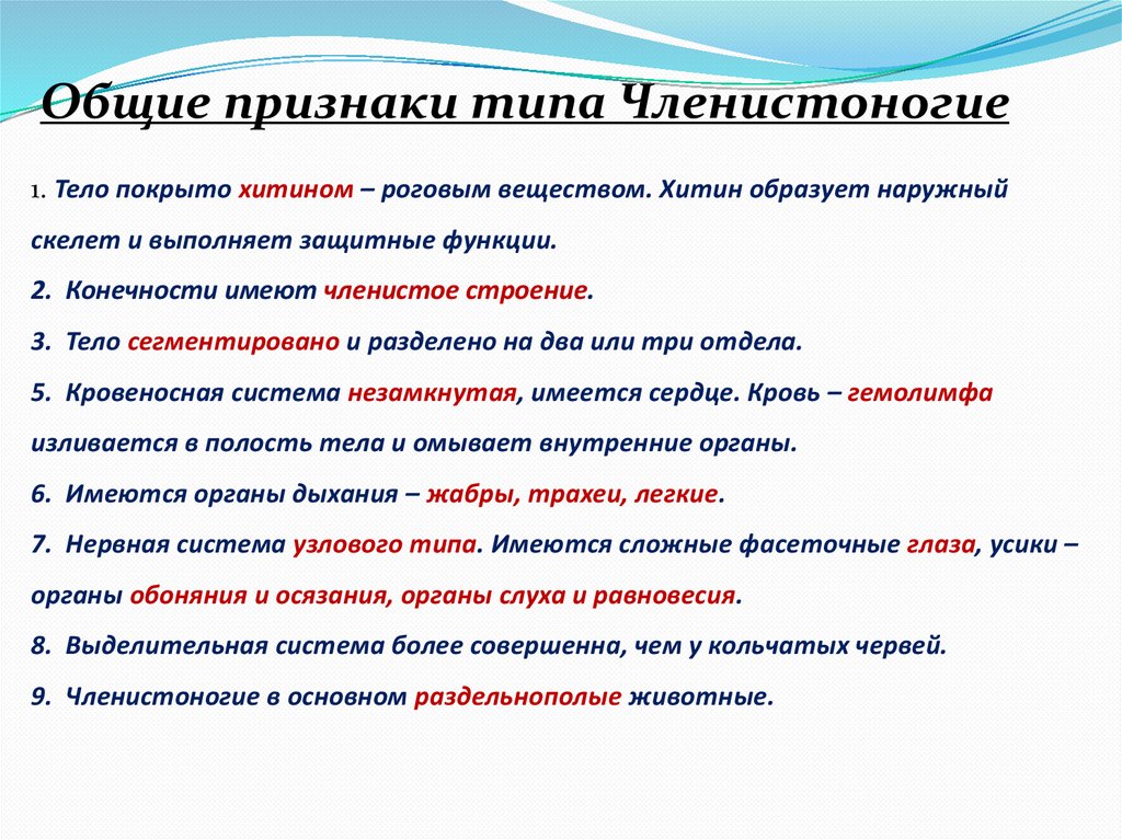 Общие признаки типа Членистоногие1. Тело покрыто хитином – роговым веществом. Хитин образует наружный