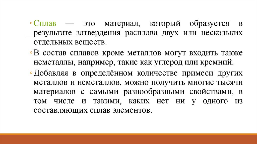 ◦Сплав — это материал, который образуется врезультате затвердения расплава двух или нескольких