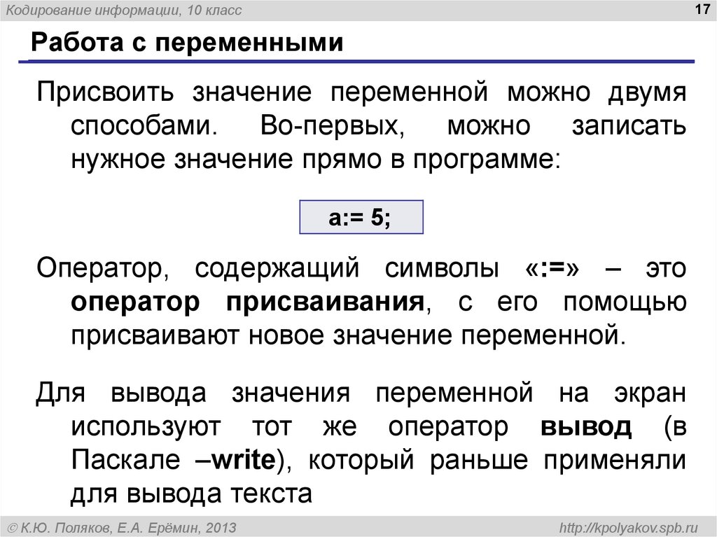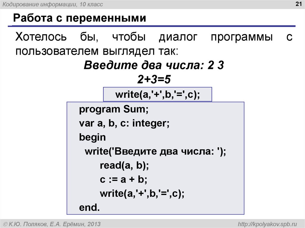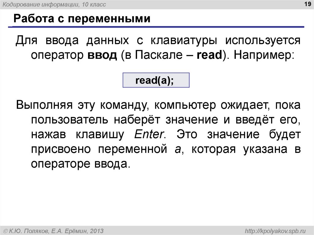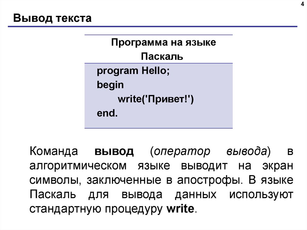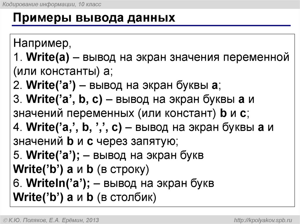 4. Write(’a,’, b, ’,’, c) – вывод на экран буквы а и