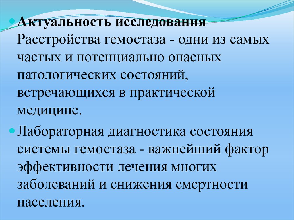 Актуальность исследованияРасстройства гемостаза - одни из самых