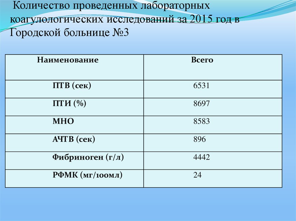 Количество проведенных лабораторныхкоагулологических исследований за 2015 год в