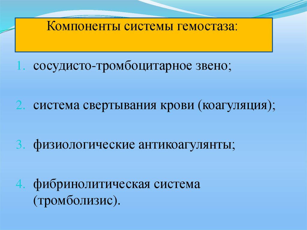 Компоненты системы гемостаза:1. сосудисто-тромбоцитарное звено;