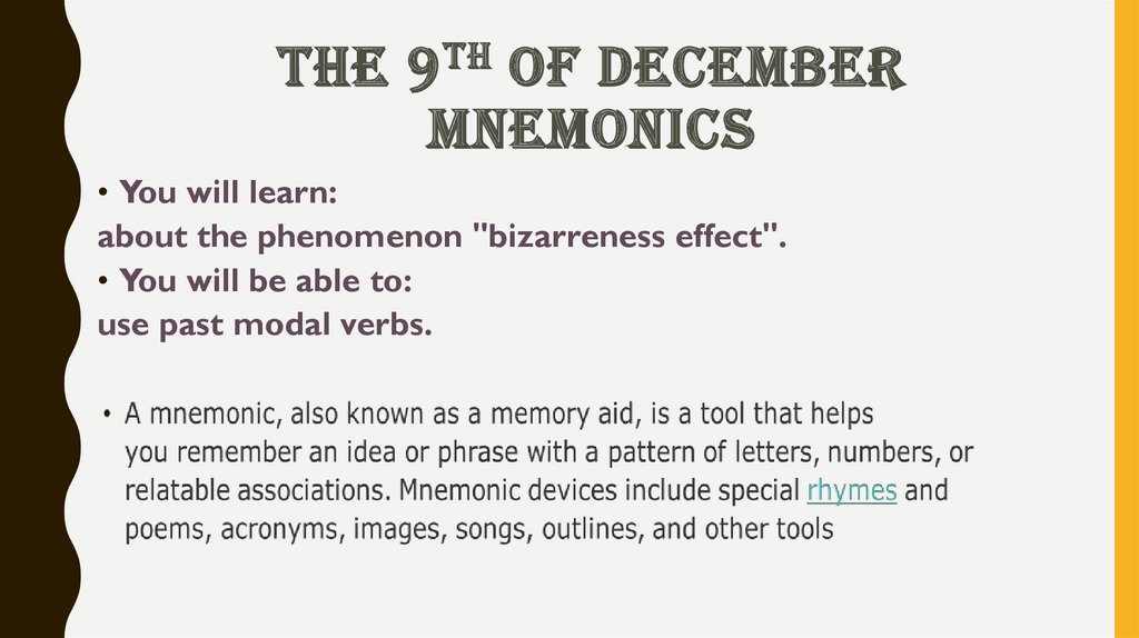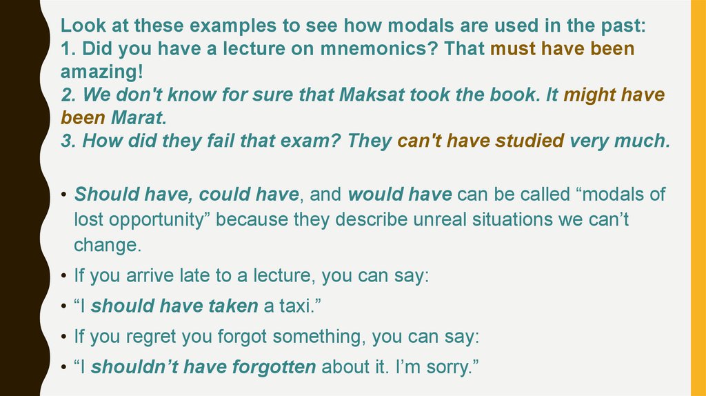 Look at these examples to see how modals are used in the past:1. Did you have a lecture on mnemonics? That must have been