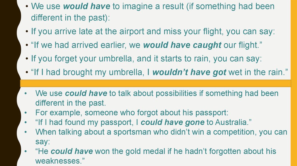 • We use would have to imagine a result (if something had beendifferent in the past):