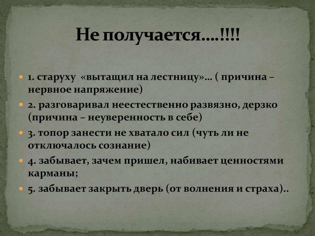 1. старуху «вытащил на лестницу»… ( причина –нервное напряжение)