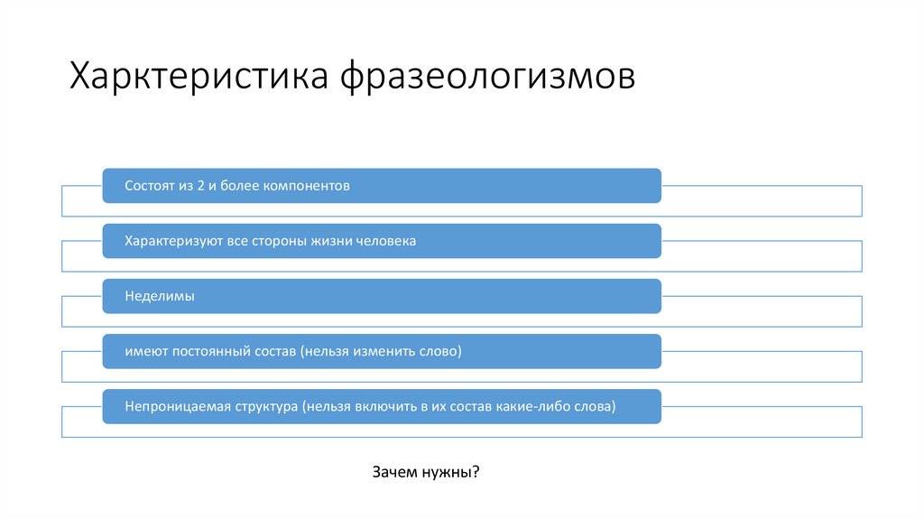Харктеристика фразеологизмовСостоят из 2 и более компонентов